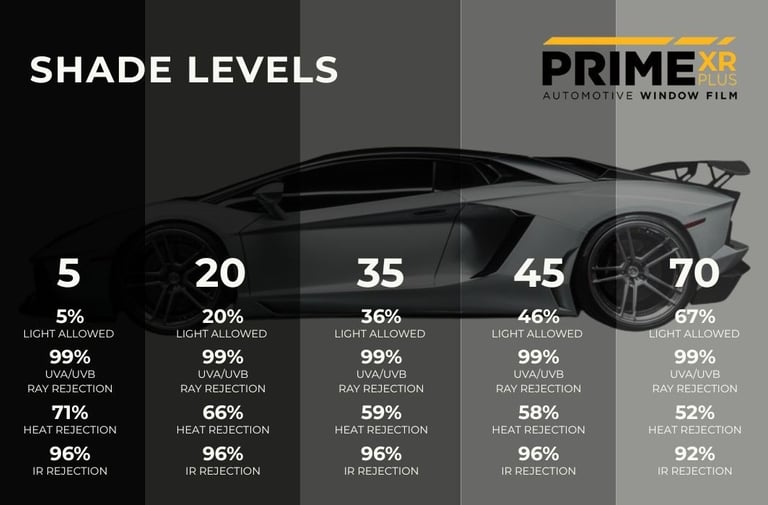 We use XPEL PRIME CS, XR, and XR Plus window films, offering excellent heat rejection, UV protection, and long-lasting performance.